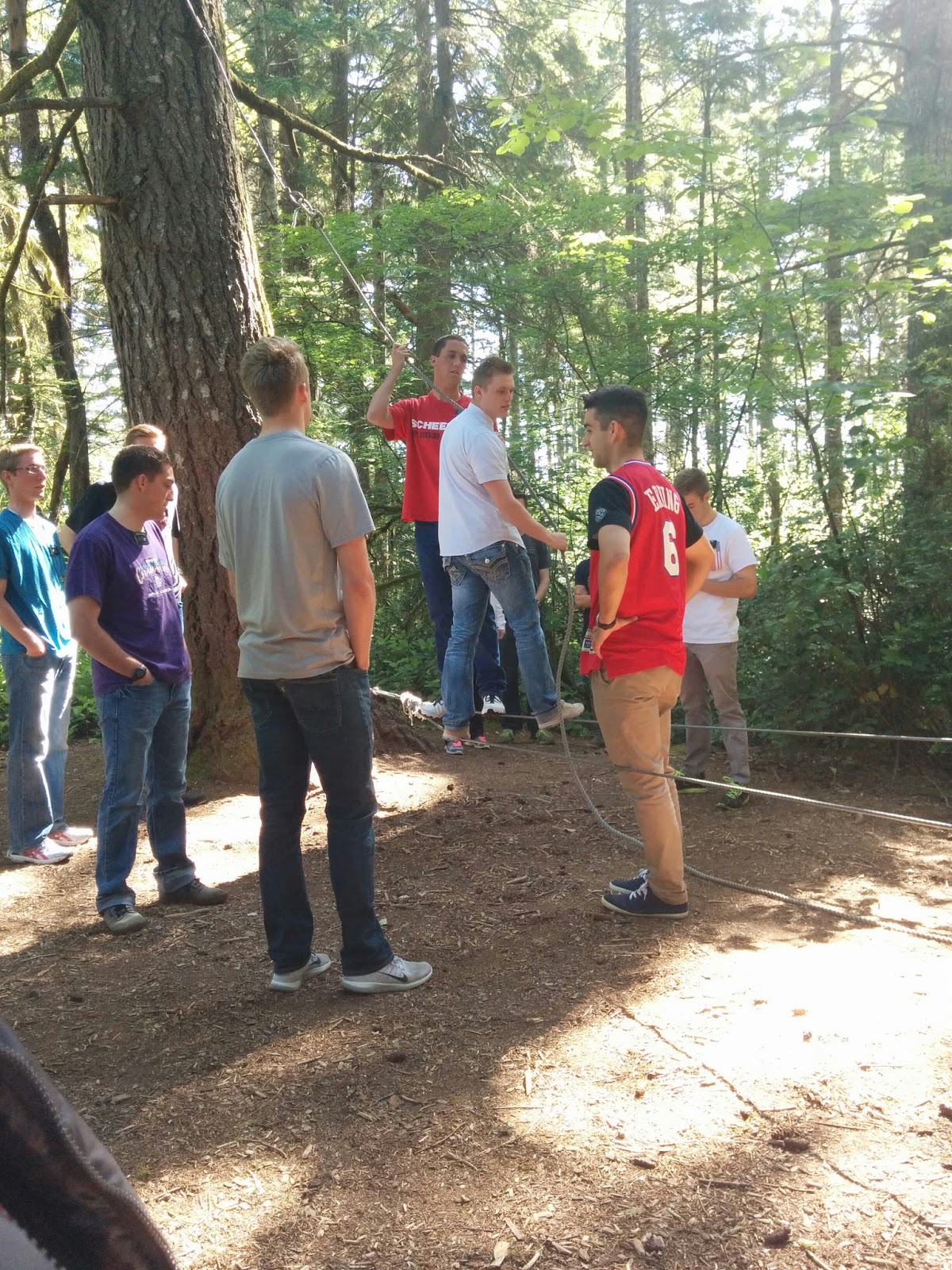 Missionaries having fun at Zion's Camp. Sister Center and I decided to pass on this balancing on ropes" activity.